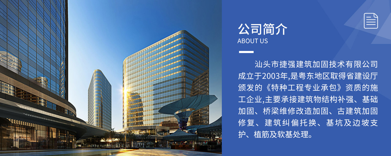 汕頭市捷強建筑加固技術有限公司 正式上線! 汕頭市捷強建筑加固技術有限公司是粵東地區(qū)取得省建設廳頒發(fā)的《特種工程專業(yè)承包》資質的施工企業(yè)。 我們堅信,捷強能以其精湛的施工技術,特優(yōu)的品質價格贏得您的信賴與合作!
